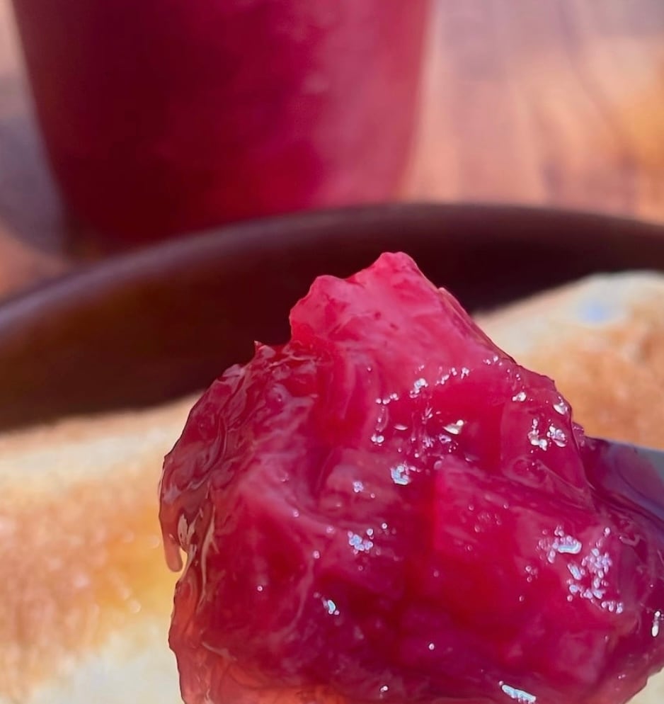 大沼ガロハーブガーデンの有機レッドルバーブと有機きび砂糖で作った宝石のような真っ赤なジャムです。