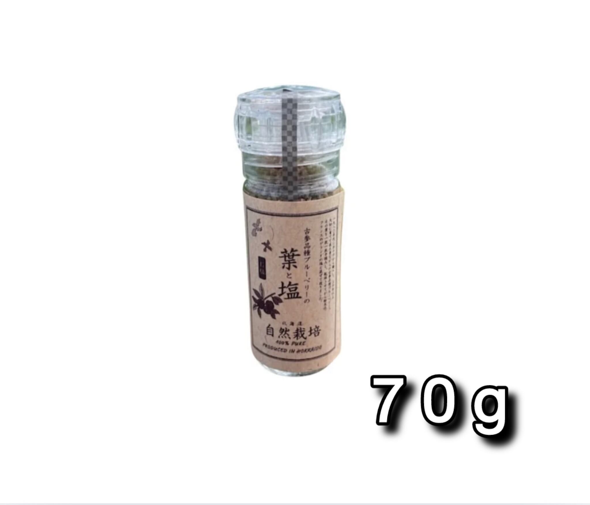 農薬・除草剤・動物性/科学肥料を一切使用せず栽培したハウレット農園のブルーベリーの葉で作ったハーブソルト「古参品種ブルーベリーの葉」をミル瓶に入れました。