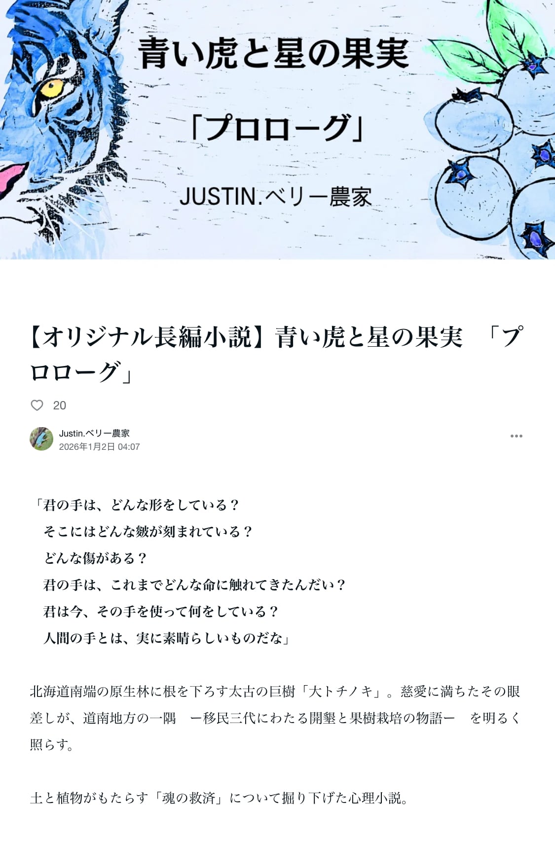 園主オリジナル長編小説#2こちらは三代にわたる農園の歴史を客観的な視点から語った、純文学色の強い心理小説です。実話とフィクションを織り交ぜつつ、ゆったりとした語り口でひとつひとつの言葉を丁寧に紡ぐように意識しました。土づくりから、定植、剪定、草取り、収穫まで、果樹栽培の全工程を追体験できる作りになっています。※画像タップorクリックでプロローグを試し読みできます